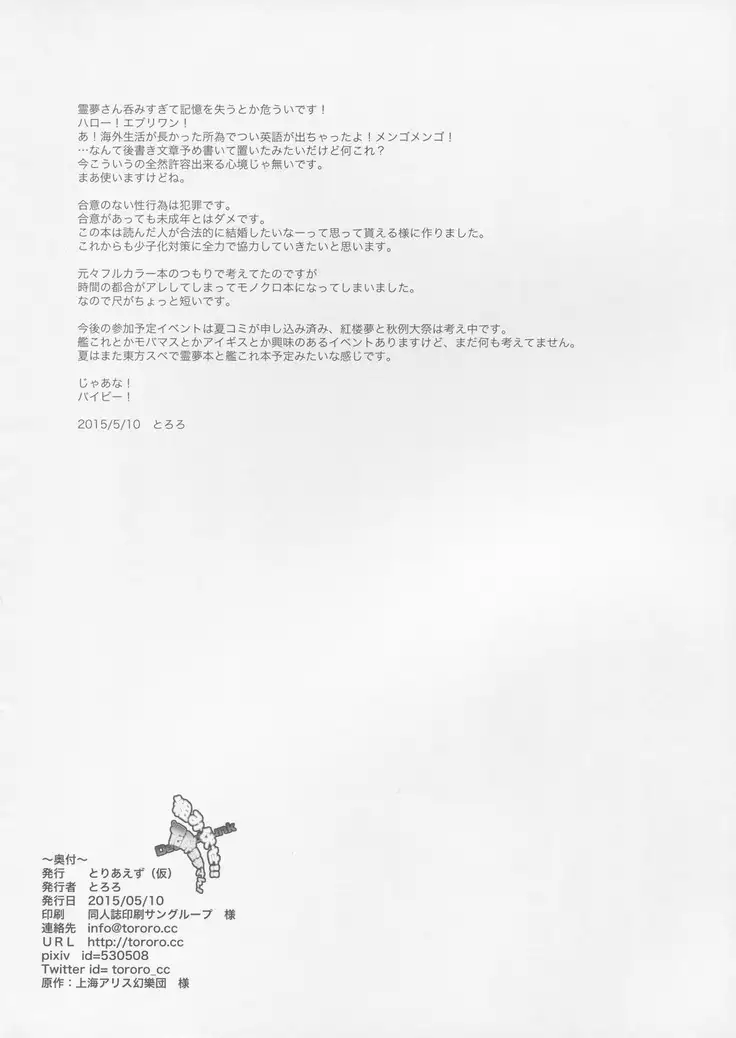 (Reitaisai 12) [Toriaezu(kari) (Tororo)] Kumifuse!! Deisui Reimu-san! (Touhou Project)